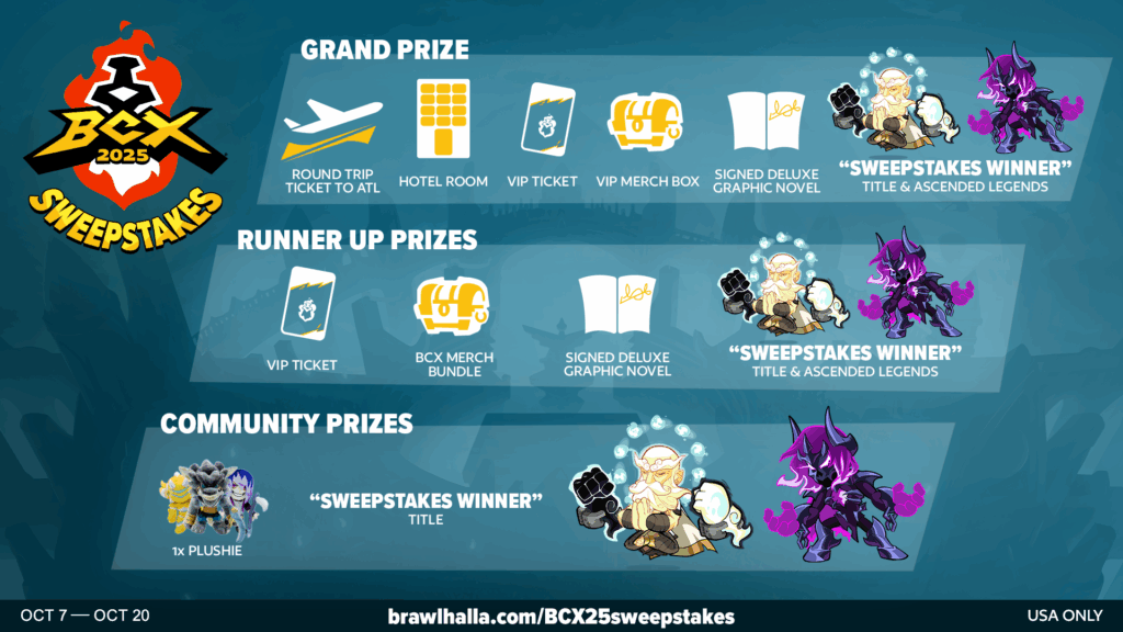 Read the Official Rules before entering into the BCX 2025 Sweepstakes. (https://www.Brawlhalla.com/BCX25sweepstakesrules)