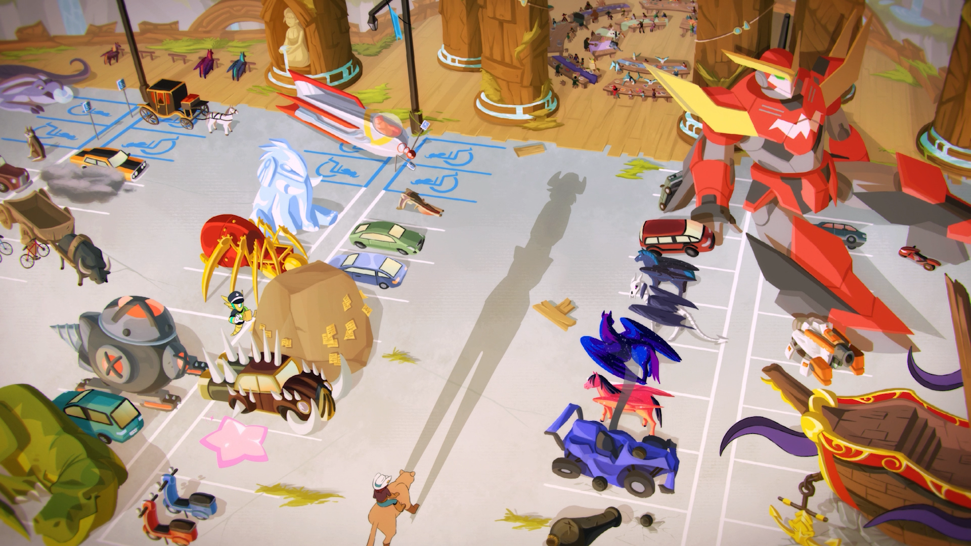 The parking lot has a lot of easter eggs, and we’ll only point out a few. Ember’s wolf, Ash, and Kaya’s mammoth, Blue, make an appearance. And Nix’s bone horse, Lucy, and Brynn’s noble steed Midnight are hanging out. Glad they’re still friends after the graphic novel. Lord Vraxx has rudely parked his ship in a handicap spot, and an extra little detail: the boulder is Gnash’s. No one’s sure how it got there, though.