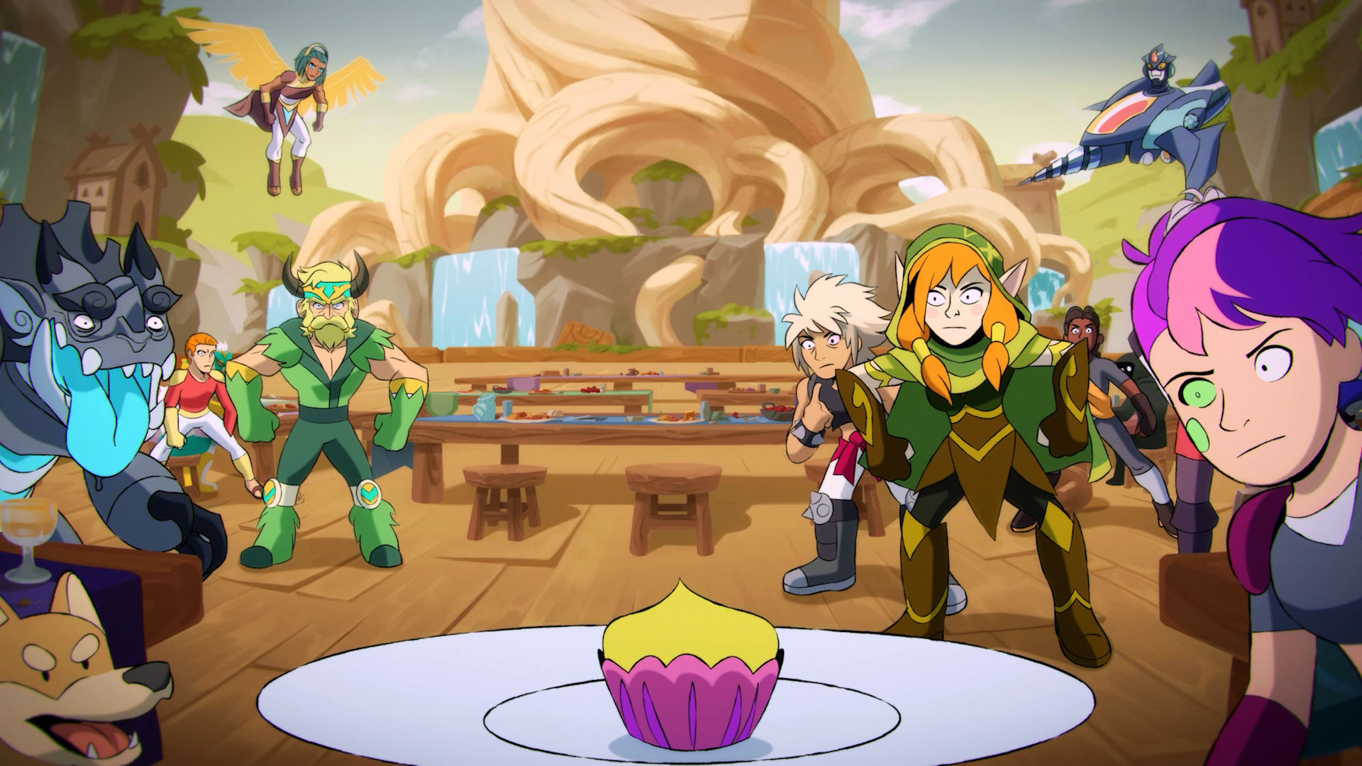 The fight cloud that steals the cupcakes is a direct reference to our first logo that we used from closed alpha in 2014 until 2017. There’s also Boomer, the dog Sidekick down at the bottom left, and Vector looking hilarious up there at the top right.