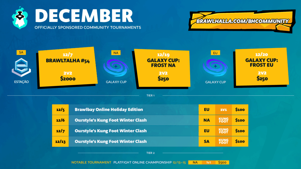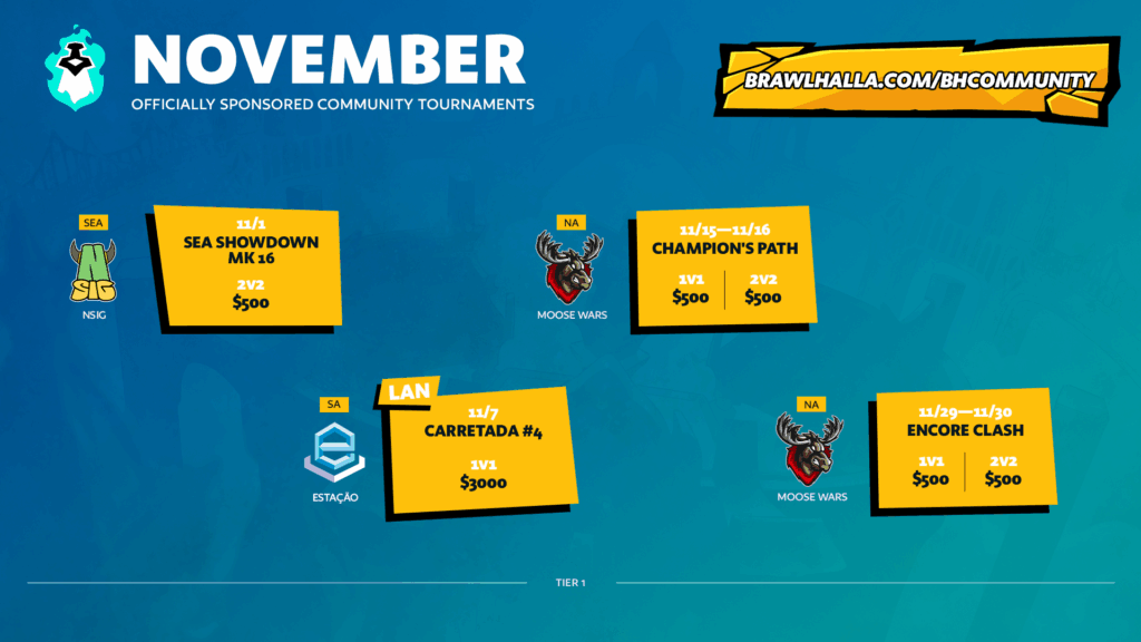 Officially sponsored Community tournament organizers are hard at work bringing you events. You can find all of their pages linked on Brawlhalla.com/Challenger and listed below!